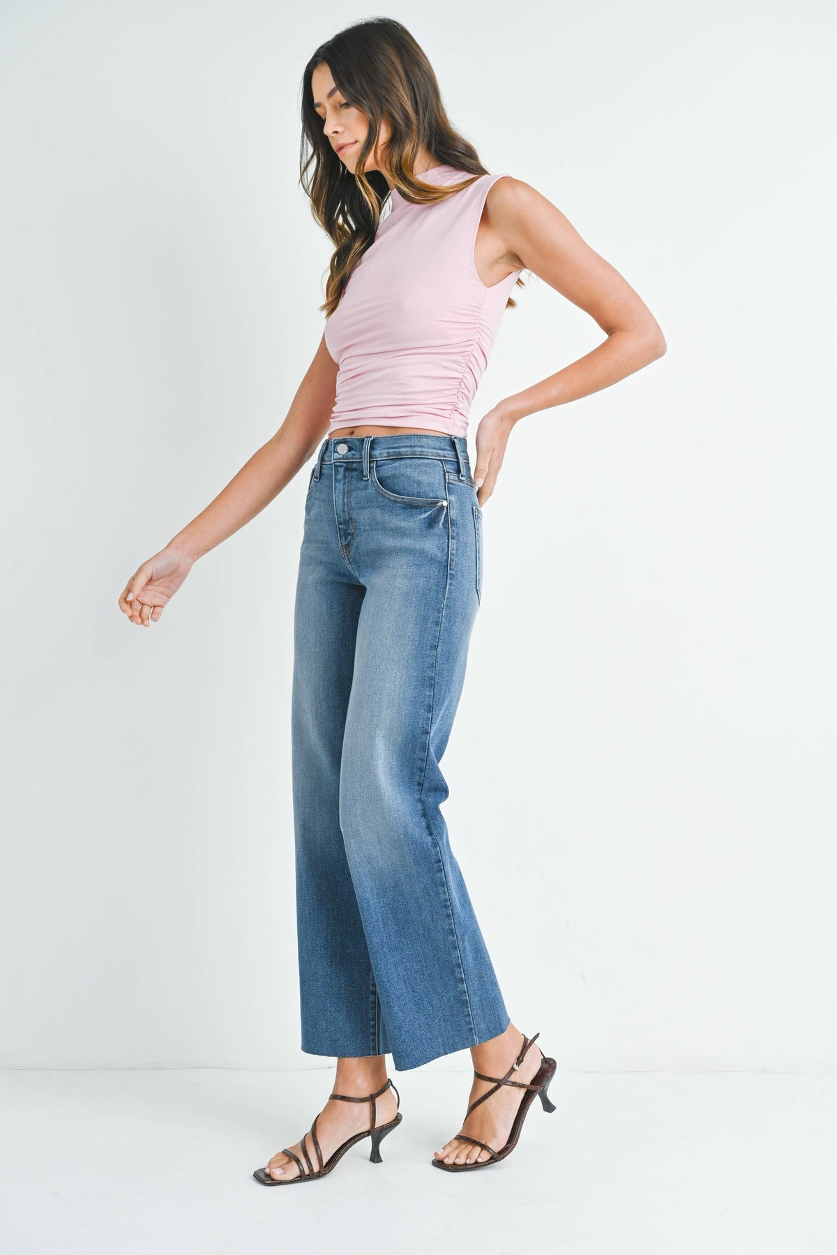 Elevate your everyday denim with the Slim Palazzo Wide Leg Scissor Cut Jean in Medium Denim. Designed with a flattering high-rise waist and a modern slim palazzo silhouette, this style elongates the legs while offering effortless comfort.