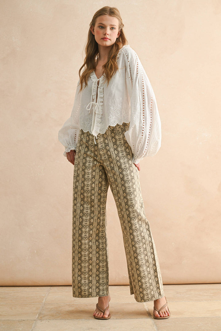 Crafted with a slim, tailored silhouette and just the right amount of stretch, these pants move with you while maintaining a polished look. The striking snake print adds a statement-making touch, while the versatile cut lets you dress them up with heels or keep them edgy with boots. A wardrobe essential for anyone ready to stand out.